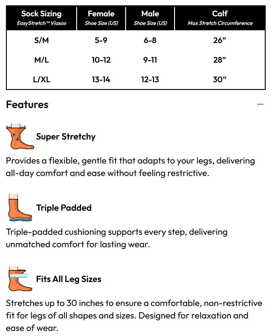 Viasox EasyStretch™ Socks feature innovative non-binding technology, stretching up to 30 inches to gently conform to your legs. Designed to fit all leg and foot sizes, they deliver unmatched comfort and support for all-day wear.
